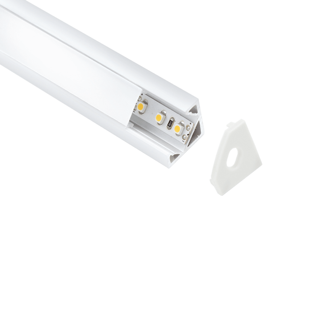 Profilo alluminio angolare L. 2 mt per strisce led, confezionato singolarmente con nr. 1 diffusore in policarbonato opaco, nr. 2 tappi chiusi, nr. 1 tappo con foro, nr. 4 clips di fissaggio il tutto incluso nella confezione