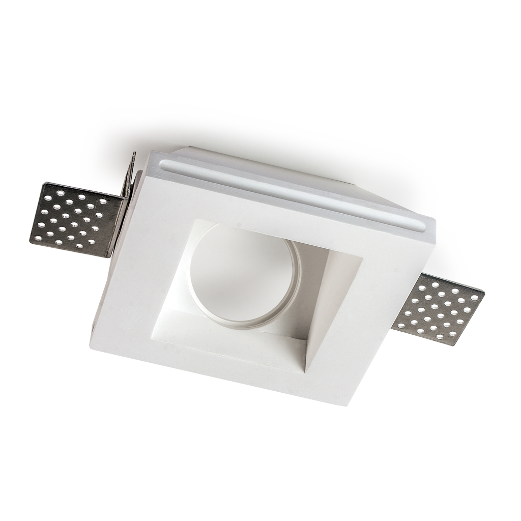 Faretto da incasso quadrato in gesso H 65 mm, con punto luce inclinato, da integrare nel cartongesso per dare omogeneità tra soffitto e corpo illuminante.