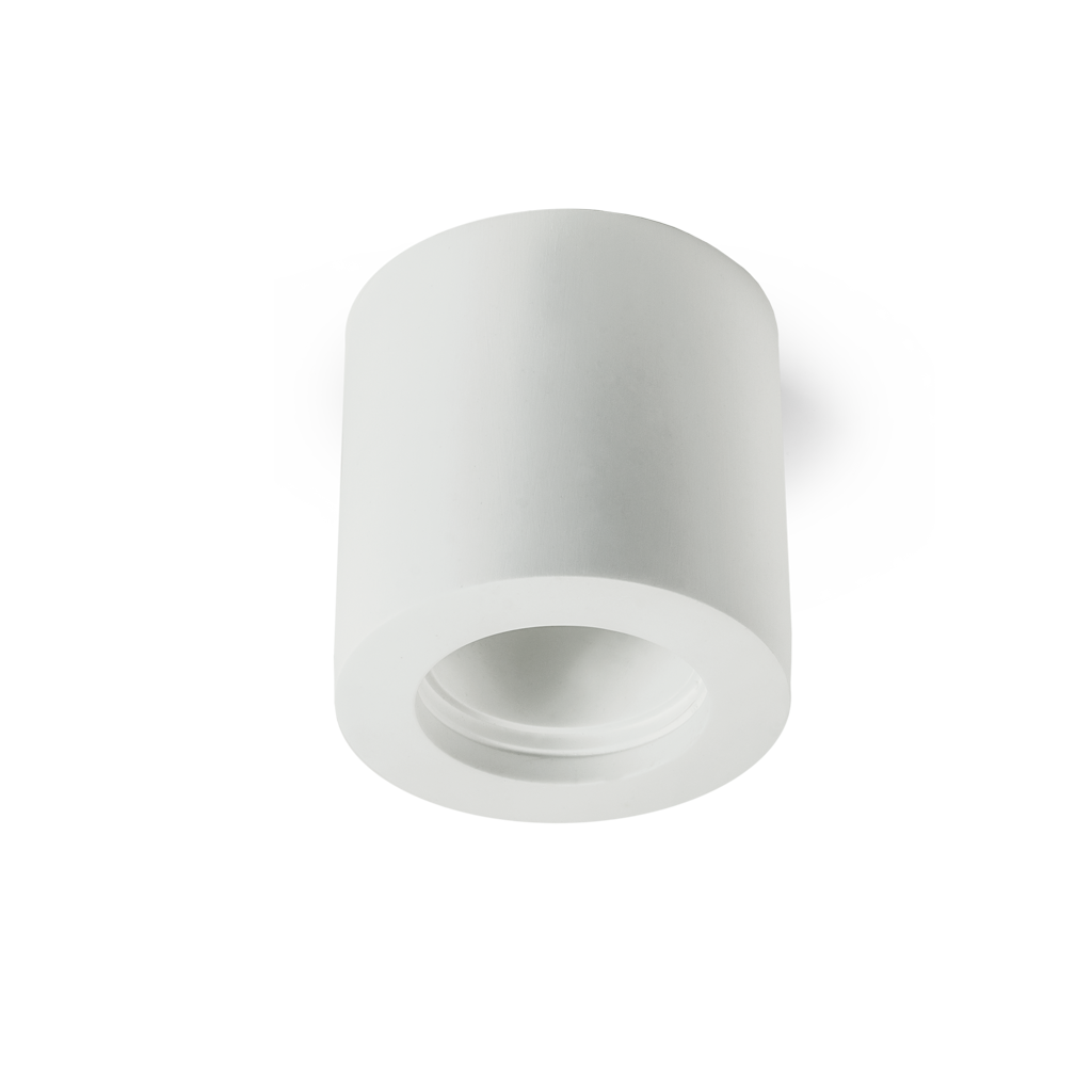 Cilindro da superficie in gesso H 80 mm, con attacco a scomparsa tra soffitto e corpo illuminante.